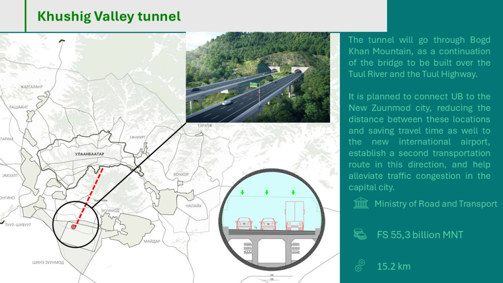 The tunnel will go through Bogd Khan Mountain, as a continuation of the bridge to be built over the Tuul River and the Tuul Highway.